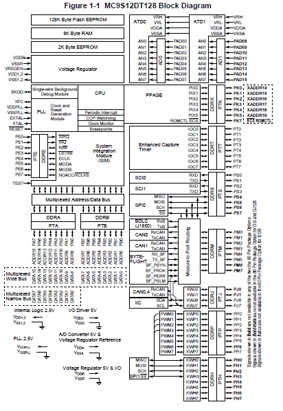 MC9S12DJ128VPVE features: (1)Memory: 128K Flash EEPROM; 2K byte EEPROM; 8K byte RAM; (2)Two 8-channel Analog-to-Digital Converters: 10-bit resolution; External conversion trigger capability; (3)Three 1M bit per second, CAN 2.0 A, B software compatible modules: Five receive and three transmit buffers; Flexible identifier filter programmable as 2 x 32 bit, 4 x 16 bit or 8 x 8 bit; Four separate interrupt channels for Rx, Tx, error and wake-up; Low-pass filter wake-up function; Loop-back for self test operation; (4)Enhanced Capture Timer: 16-bit main counter with 7-bit prescaler; 8 programmable input capture or output compare channels; Four 8-bit or two 16-bit pulse accumulators; (5)8 PWM channels: Programmable period and duty cycle; 8-bit 8-channel or 16-bit 4-channel; separate control for each pulse width and duty cycle; center-aligned or left-aligned outputs; programmable clock select logic with a wide range of frequencies; Fast emergency shutdown input; Usable as interrupt inputs.